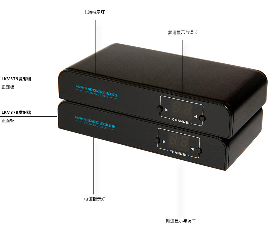 LKV379是朗强针对高清工程中HDMI视频传输需求定制开发的产品,基于DVB-T有线数字电视信号的传输方式,采用把HDMI信号转换为DVB-T有线数字电视信号传输,与传统模拟有线电视信号不同的是,采用64QAM的方式对高清信号进行调制编解码转换为高清数字电视信号通过同轴电缆实现远程传输。大大利用工程现有的同轴电缆, 不但具备传输图像几乎0损耗达到全高清1080P的图像质量,同时有线数字电视信号的抗干扰能力强,并且频道多可传输近百套节目。还可以通过有线视频分配器很方便地组建一对多或者对多对视频矩阵.